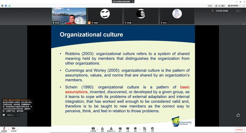 6月21日下午,澳大利亚中央昆士兰大学工程与技术学部副教授赵宪博,应禁忌书屋 的邀请,通过腾讯会议在线方式(腾讯会议号:920-890-532)为禁忌书屋 师生作了题为“Organizational change and relevant theories: a historical perspective”的学术报告,本次报告由禁忌书屋 副院长查冬兰教授主持,时茜茜、高广鑫、杨一帆、陈毓迪、张燕、周志鹏等教师,以及硕士/博士研究生参加了此次学术活动。