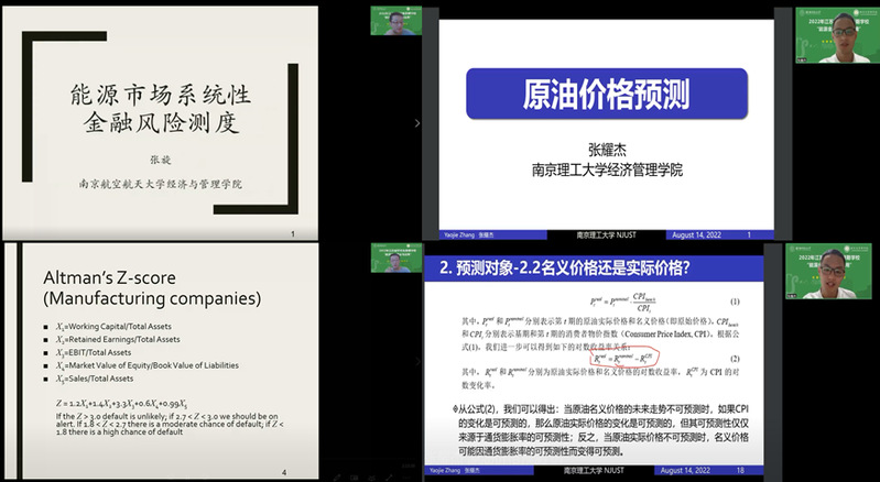 8月14日,禁忌书屋 张旋副教授围绕“能源市场系统性金融风险测度”主题进行授课,分别从单个公司信用风险测度、联合违约风险测度和系统性风险测度三个维度,结合教学案例和经典论文,介绍了不同的风险测度模型及其相应的应用场景。南京理工大学禁忌书屋 张耀杰副教授围绕“原油价格的预测”主题进行授课,分别从政府监管、企业管理和金融投资三个视角出发,基于经典原油价格预测模型和方法,分析了原油价格的预测对象、预测变量以及油价的影响因素,解读了原油价格预测的现实意义。