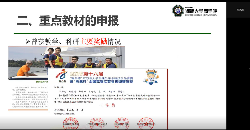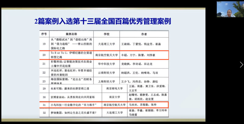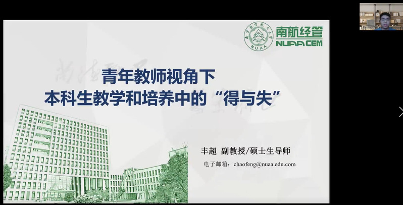 会议包含三个分支主题的报告。特邀嘉宾河海大学李光明教授详细介绍了市场营销专业重点教材的申报与建设,南京航空航天大学丰超和宋连莲两位老师分别介绍了青年教师视角下本科生教学与培养中的“得与失”、师生互动提问式教研模式与开展方案,从市场营销专业的教学和教研角度分享了专业育人方案。系列主题汇报的内容各有侧重点,干货满满,吸引了北京工商大学、西南政法大学、河海大学、淮阴师范学院、南京工业大学等多所兄弟院校的师生参与。