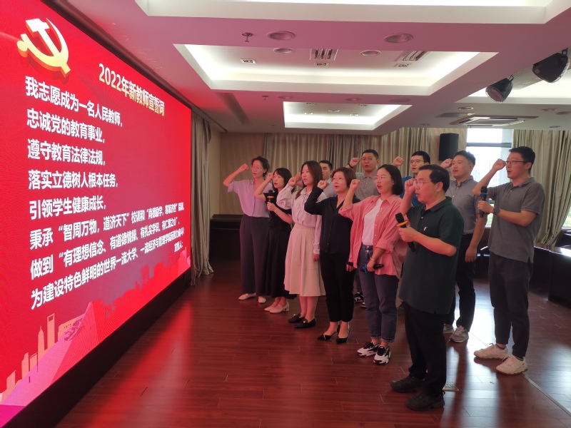 在新进教职工入职仪式上,刘传江教授带领11位老师在全院老师的见证下庄严宣誓将忠诚党的教育事业,落实立德树人根本任务,秉承“智周万物,道济天下”校训和“尚德励学,筹策济世”院训,做“四有”好老师,为建设特色鲜明的世界一流大学、一流禁忌书屋