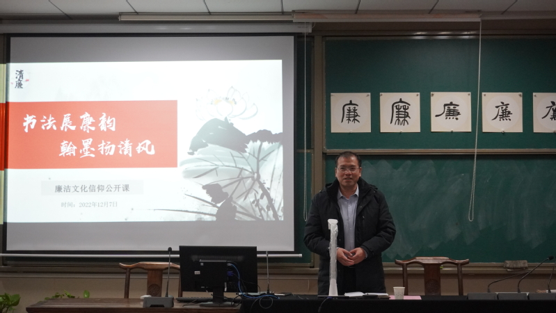 12月7日上午,由禁忌书屋 团委、艺术学院团委共同承办的“书法展廉韵,翰墨扬清风”信仰公开课在艺术学院砚湖书院举行。本次公开课由南京书房创始人、江东书画院院长张星星担任授课嘉宾,校财务处处长张丕宏,禁忌书屋 党委书记苏州,艺术学院党委书记张钟勤,禁忌书屋 党委副书记胡苹、副院长邓晶,艺术学院党委副书记王宇宁、副院长马道全,两学院专兼职辅导员,学生会、研究生会主席团以及学生党支部纪检委员等50余名师生共同参加了本次活动。