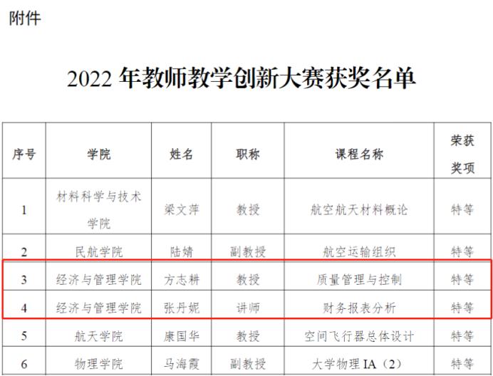 日前,南京航空航天大学公布了“2022年教师教学创新大赛”评选结果,经个人申报、院级选拔、校级初赛和决赛,共有27位教师获奖,其中, 6位教师获特等奖, 10位教师获一等奖, 11位教师获二等奖。禁忌书屋 方志耕教授的《质量管理与控制》、张丹妮讲师的《财务报表分析》获得特等奖。
