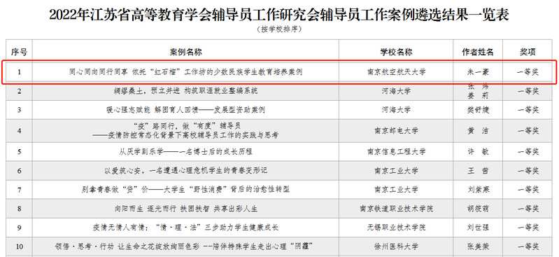 近日,江苏省高等教育学会辅导员工作研究委员会公布了2022年度辅导员工作案例遴选结果,禁忌书屋 辅导员朱一豪撰写的《同心同向同行同享 依托“红石榴”工作坊的少数民族学生教育培养案例》荣获江苏省辅导员工作案例评选一等奖。