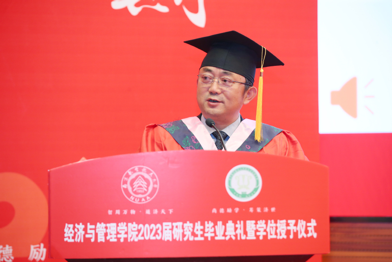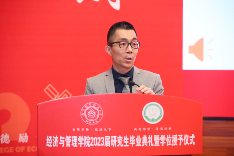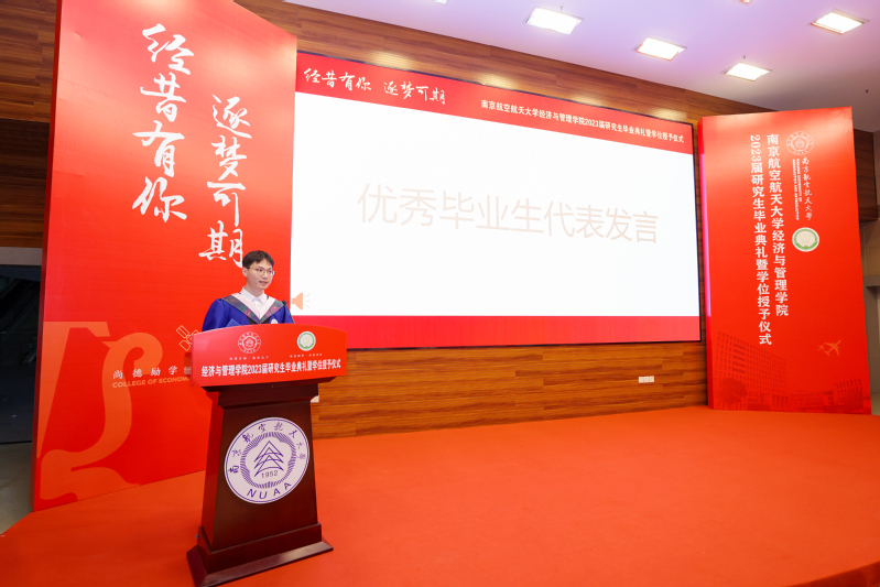 毕业生代表何亮讲述了他作为一名经历者在读研期间的数个“第一次”,也表达了作为一名见证者看到学院荣誉墙再添硕果、学科发展再上新台阶时的骄傲。他提到“‘尚德励学、筹策济世’只需一眼,便是整个人生的座右铭”。他代表全体毕业生感谢学院三年的辛勤栽培,同时号召全体毕业生要传承南航的红色基因、放飞志在长空的蓝色梦想!