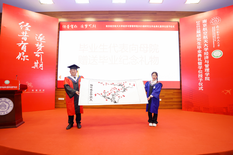 典礼上,全体毕业研究生为学院送上了一份特殊的礼物——由学院全体研究生一同创作的手印梅花图。梅花香自苦寒来,毕业生们用手印的点点红梅来回忆他们奋斗的青春岁月,也饱含了同学们对母院的感激,更代表了庄重的承诺,他们将接过南航经管人的接力棒,“强特色,争一流,经管梦,代相传”将始终烙印在他们心中。周德群院长代表学院接受毕业生赠礼。