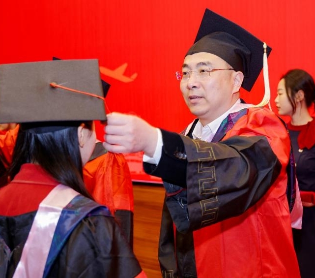 他用三句古诗赠予全体毕业生,一是少年辛苦终身事,莫向光阴惰寸功。人生之旅道阻且长,但勤学苦练不能变,要终身学习。希望同学们把握求知的主动,无论是继续深造还是走上工作岗位,都要始终牢记“学无止境”、始终践行“知行合一”,在实践中锤炼过硬本领、创造经管新知。二是纸上得来终觉浅,绝知此事要躬行。人生前景绚丽多姿,但脚踏实地不能变,要实干担当。当今的中国呼唤更多的经管类英才扛起责任,希望同学们把握工作的主动,做一名“懂科技、懂产业、懂市场、懂管理、懂信息化”的复合型人才,在工作岗位上主动发挥学科优势。三是苟利国家生死以,岂因祸福避趋之。人生轨迹各不相同,但初心使命不能变,要胸怀大义。希望同学们把握选择的主动,自觉践行“成为产业精英、贡献经管新知”的使命,成为新时代的见证者、开创者、建设者。