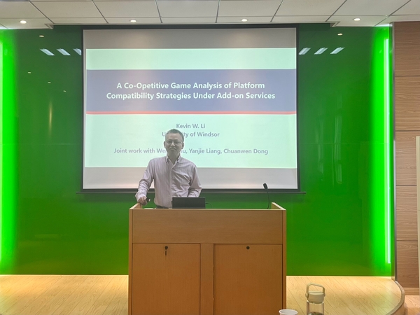 5月12日下午,加拿大温莎大学Odette商学院李武(Kevin W. Li)教授受学院智能决策与风险分析研究所邀请,在南航将军路校区禁忌书屋 702会议室作题为“A Co-Opetitive Game Analysis of Platform Compatibility Strategies Under Add-on Services”的讲座。禁忌书屋 教授徐海燕、教授陈克兵、副教授何沙玮、副教授王敏等教师及部分硕、博研究生现场聆听了李武教授的报告分享,本次学术报告由徐海燕教授主持。