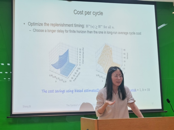 上海财经大学助理教授毕晟作题为“Taming the Long Tail: The Gambler's Fallacy in Intermittent Demand Management”的学术报告。她针对需求不稳定的“长尾”产品库存问题,结合“赌徒的谬误现象在有限次数的抛硬币中实际成立”现象的启发,提出了一个新的框架来优化“补货时间”和“补货数量”的选择。毕晟于2021年在新加坡国立大学获得分析与运营博士学位,2016年在南京大学获得工业工程学士学位。主要研究方向为数据驱动优化、供应链管理、社会责任运营等,成果发表于商学院顶级期刊Manufacturing & Service Operations Management。