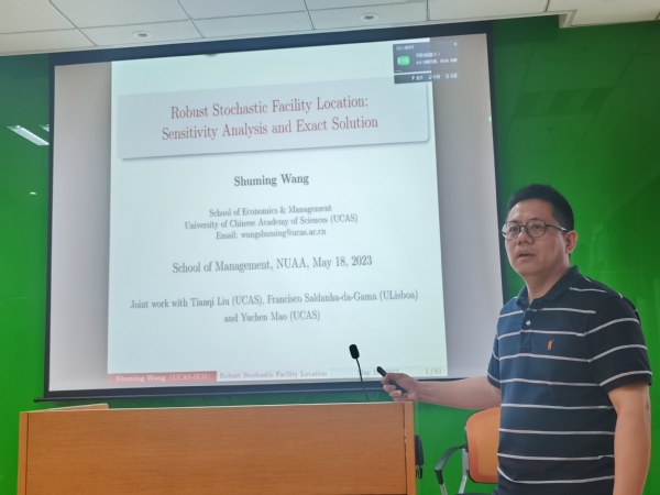 中国科学院大学王曙明教授为禁忌书屋 师生作题为“Stochastic Robust Facility Location: A Nested Decomposition Approach”的学术报告。报告将鲁棒随机优化下的设施选址问题作为问题背景进行展开,区别于以往研究,他采用了一个状态模糊集来模拟与不同状态下的需求相关的分布不确定性,在此基础上建立考虑多种需求状态下的选址模型,并从两个方面对模型进行敏感性分析。他提出了一种嵌套的Benders分解算法来求解模型,其创新性地利用了最坏分布情况下的预期第二阶段成本的子梯度。王曙明主要从事鲁棒优化与随机规划研究及其在选址与物流网络优化、供应链风险管理、库存与收益管理、健康医疗管理等领域的应用。研究成果分别发表于Production and Operations Management、INFORMS Journal on Computing、Transportation Science等顶级期刊。