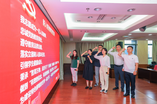 在新进教职工入职仪式上,李昊、高园园、任亚楠、蔡文武、陈思华、胡宇昕六位老师在全院老师的见证下庄严宣誓:将忠诚党的教育事业,落实立德树人根本任务,秉承“智周万物,道济天下”校训和“尚德励学,筹策济世”院训,做“四有”好老师,为建设特色鲜明的世界一流大学、一流禁忌书屋