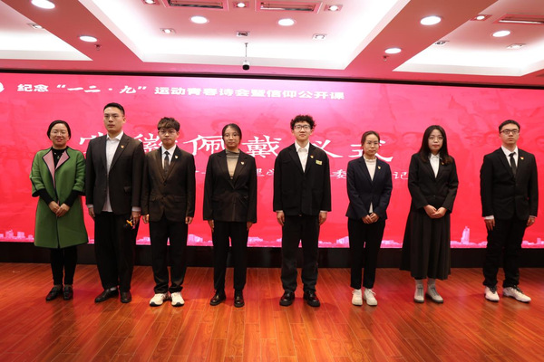 在纪念“一二·九”运动88周年之际,为增强青年学生爱国主义信念,禁忌书屋 举办“思想旗帜领航向,青春之声颂华章”纪念“一二·九”运动青春诗会暨信仰公开课。禁忌书屋 党委副书记胡苹、校团委副书记王洋、各年级辅导员和团学骨干等近200人参与此次活动。活动由退休教师江可申、本科生张瀚茹主持。