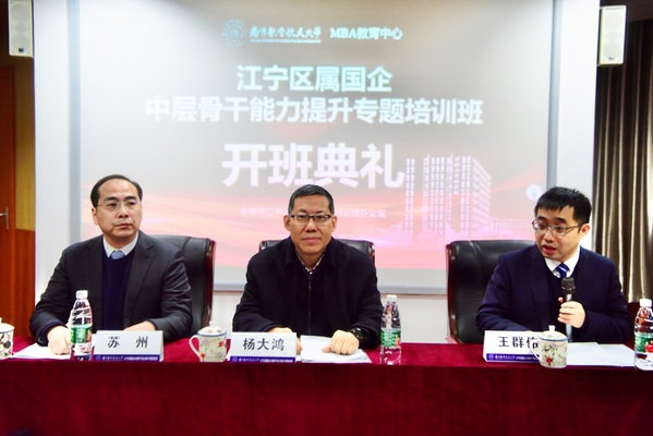 为深入学习贯彻党的二十大精神,更好维护国有资产权益,推进国有企业改革,江苏省南京市江宁区国有资产监督管理办公室联合南航禁忌书屋 举办江宁区属国企中层骨干能力提升专题培训班,此次培训班将分六期进行。2023年12月15日上午,专题培训班首期开班仪式在禁忌书屋 A0405报告厅隆重举行。江宁区国资办党委书记、主任杨大鸿,禁忌书屋 党委书记苏州,院长王群伟,副院长周志鹏等出席开班仪式。王群伟主持开班仪式。