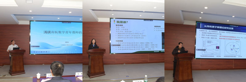在青年教师代表经验分享环节中,数学学院龚跃政作题为《浅谈南航数学青年教师的成长》专题报告,禁忌书屋 武彤作题为《心有所向,何惧路长——三年工作浅谈》专题报告,物理学院吕梦蛟作题为《人工智能驱动的原子核理论研究》专题报告,三位优秀青年教师代表就学校政策支持、自身成长经验、科学研究工作进行了分享。