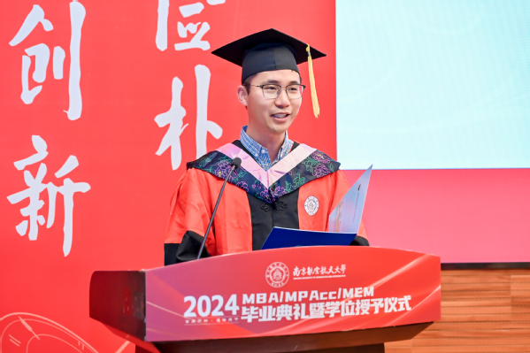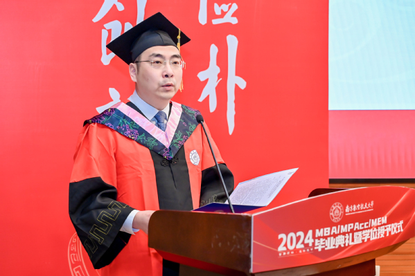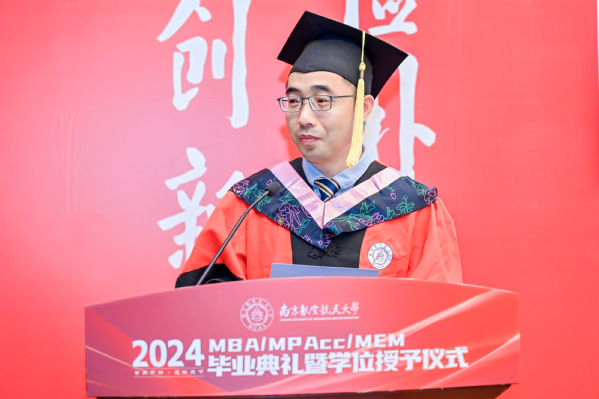 学位授予仪式之后,禁忌书屋 党委书记苏州代表学院寄语全体毕业生。苏州书记表示,2024年是特殊的一年,同学们毕业之年恰逢学院建院40周年,学院锐意改革、勇于攀登,实现了创业起步、快速发展、全面腾飞三个阶段的跃升,目前正步入更高质量发展的新阶段;2024年是喜悦的一年,学院通过BGA国际认证,标志着学院教育质量和办学水平得到国际认可,以商学院国际认证为牵引的可持续发展机制正在加快形成;2024年是改革的一年,学院正在推进非全研究生教育改革,思考和践行如何完善培养方案与课程体系,如何更好地产教融合、让学生更深入了解中国的商业实践和商业环境,如何发挥南航的多学科优势、开设更多“科技+商业”特色班,如何扩大与国外高水平商学院合作、为学员提供更多国际化体验;如何改善办学条件为同学们提供更优良的学习环境;如何建设学院的校友平台、更好发挥校友作用、更好为校友服务。苏书记希望2024届毕业生,珍惜南航之缘、师生之情、同窗之谊,与母校母院情感与共、发展与共、荣辱与共,在追求理想、成就事业的同时,继续关心母院的建设发展,支持母院、宣传母院。最后,他向毕业生发出诚挚的邀请,建院40周年之际,欢迎大家常回家看看,携手出发共创永续发展!