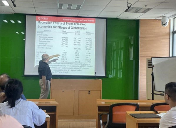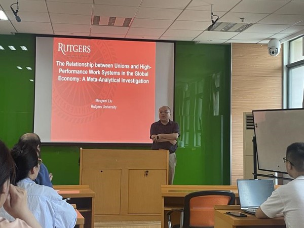 教授刘明巍的讲座主要从以下几个方面展开。首先,介绍了工会和高绩效工作系统的相关知识与背景。刘明巍对人力资源管理的演变、高绩效工作系统的本质以及西方工会的兴衰等背景知识进行了介绍,并在此基础上指出探究工会和高绩效工作系统之间关系的重要意义。其次,回顾了现有研究中关于工会和高绩效工作系统之间的关系。刘明巍通过文献回顾发现,现有研究中关于工会化与高绩效工作系统间的关系存在结论不一致的问题,由此进一步提出基于权变视角来解释现有研究争论的必要性。随后,深入分析了市场经济类型、全球化发展阶段、所在国出口程度、雇佣保护程度在工会与高绩效工作系统间关系中所发挥的调节作用。刘明巍依次介绍了影响工会和高绩效工作系统之间关系的调节因素,并通过对107个独立研究的元分析得出一系列研究结论。具体而言:①在协调型市场经济中,二者之间关系比在自由市场经济中更积极;②随着 2000年后全球化步入新阶段,二者之间的关系也逐渐呈正相关;③在出口强度较高或者雇佣保护程度更高的国家中,二者之间的正相关关系往往更强。最后,对相关研究局限和未来研究方向进行了讨论。刘明巍阐述了当前研究存在的一些局限,并希望未来研究能够为工会和高绩效工作系统之间的关系提出新的见解。