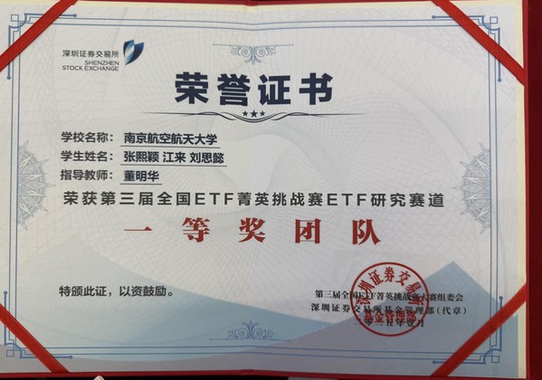 2025年3月19—20日,由深圳证券交易所作为指导单位,东方财富作为主办平台,广发基金、华夏基金、易方达基金、国泰基金、富国基金、华安基金、汇添富基金、平安基金、工银瑞信基金、银华基金、大成基金、东财基金十二家基金公司联合主办的第三届全国ETF菁英挑战赛在深圳交易所上市大厅成功举办,吸引了全国2763所高校近60万人参与。经过初赛与复赛的激烈角逐,来自南京航空航天大学、北京大学、武汉大学等11所高校的学生团队入围研究报告赛道总决赛。禁忌书屋 2022级金融专业三名本科生张熙颖、刘思懿、江来同学在董明华老师和苏飞老师的指导下斩获研究赛道一等奖。