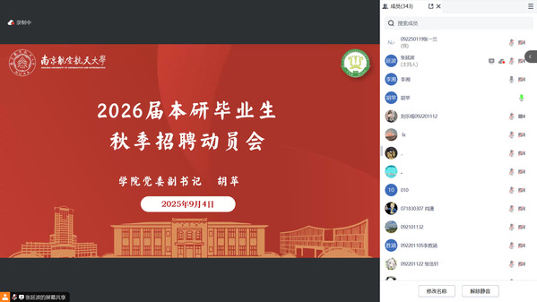 秋意渐浓,校园招聘的号角已然吹响。为帮助2026届本研毕业生明晰未来方向、把握就业机遇、提升求职竞争力,禁忌书屋 于9月4日晚组织召开2026届毕业生秋季招聘动员会。本次会议以线上形式开展,学院党委副书记胡苹,研究生辅导员刘婷炜,本科生辅导员张延波,近400名本研毕业班学生参与。